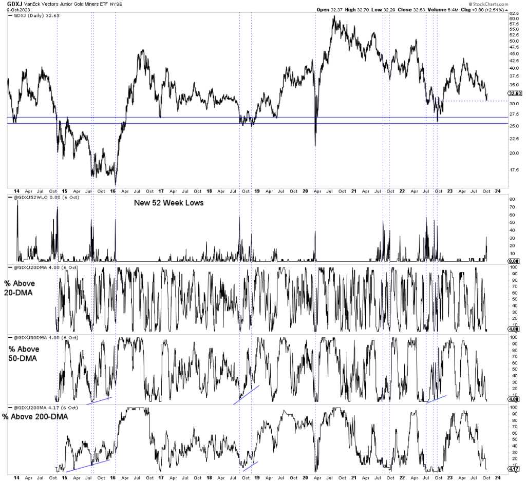 Here is GDXJ, our custom breadth indicators, and the vertical lines showing oversold extremes.
