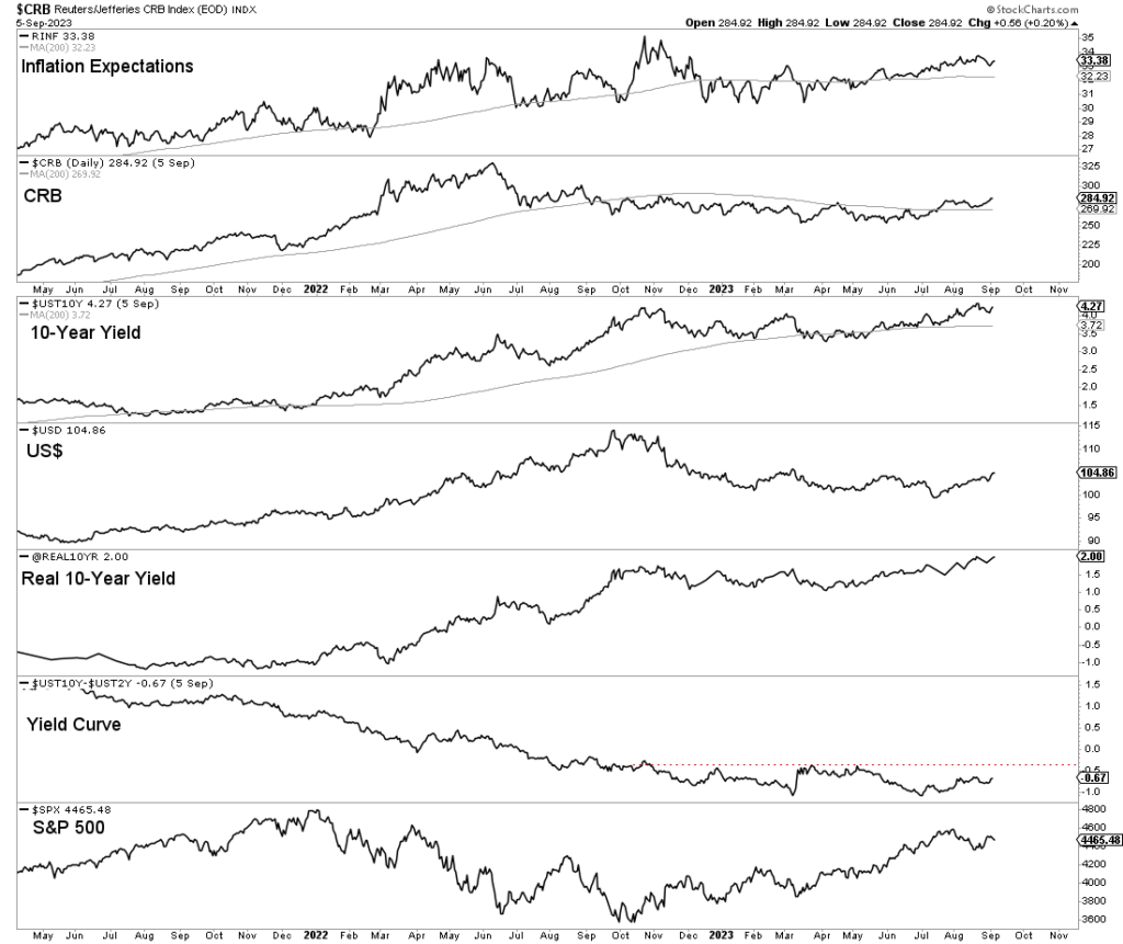 As we can see, inflation expectations and commodity prices have rebounded and are approaching their 2022 highs. Meanwhile, the 10-year yield is breaking out, which has started pulling the dollar higher.