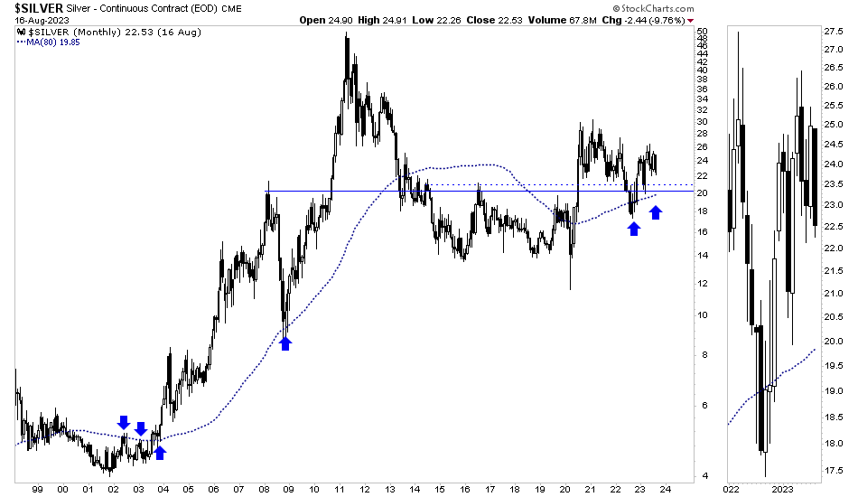 The next strong support for Silver comes in at around $20.50. The 80-month moving average (arrows), which has been quite significant for over 20 years, should surpass $20.00 before the end of the year.