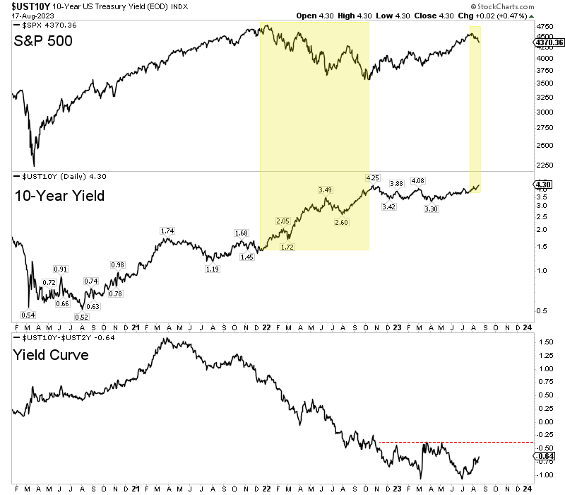 However, the 10-year yield rebounded and closed Thursday at a new 15-year high. The stock market is showing weakness again, and the yield curve (bottom of the chart) is steepening.