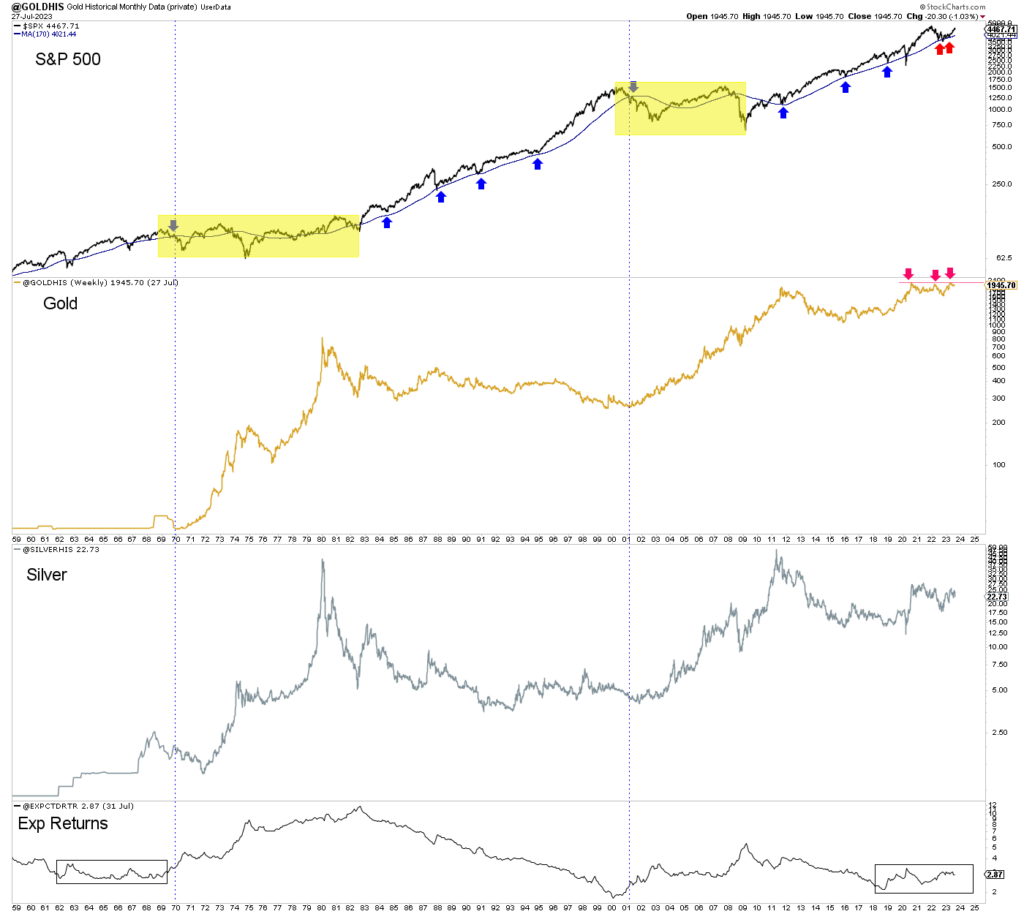 In the chart below, we plot Gold, Silver, our Expected Returns Indicator (for a 60/40 portfolio), and the S&P 500 with the weekly equivalent to its 40-month moving average. The two vertical lines mark where the S&P 500 lost its 40-month moving average.