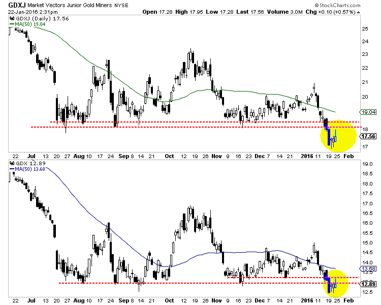 Recent relative weakness in the gold miners along with the bullish reversal in the equity market is a bearish development for precious metals. Gold and surprisingly Silver have held up well amid the decline in equities. They enjoyed a safe-haven bid yet are likely to lose that bid as the equity market begins a relief rally. The gold stocks, while initially following the stock market could resume their decline once metals have resumed their downtrends. Precious metals bulls should wait for an extreme oversold condition amid extreme bearish sentiment before turning bullish. As we navigate the end of this bear market, consider learning more about our premium service including our favorite junior miners which we expect to outperform in 2016.