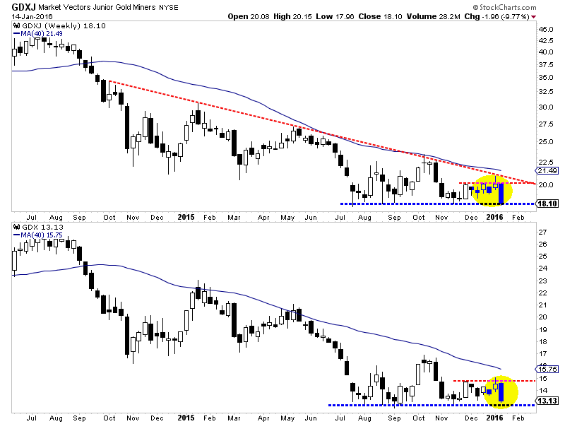 The chart below plots the weekly candles for GDXJ and GDX. Note how the miners failed to close above resistance last week. GDXJ failed to hold its gains above $20 while GDX failed to move beyond $15. The miners, since that failure have declined nearly 10% and are threatening a breakdown in the days ahead. The miners have potential measured downside targets of $10.30 for GDX and $13 for GDXJ.