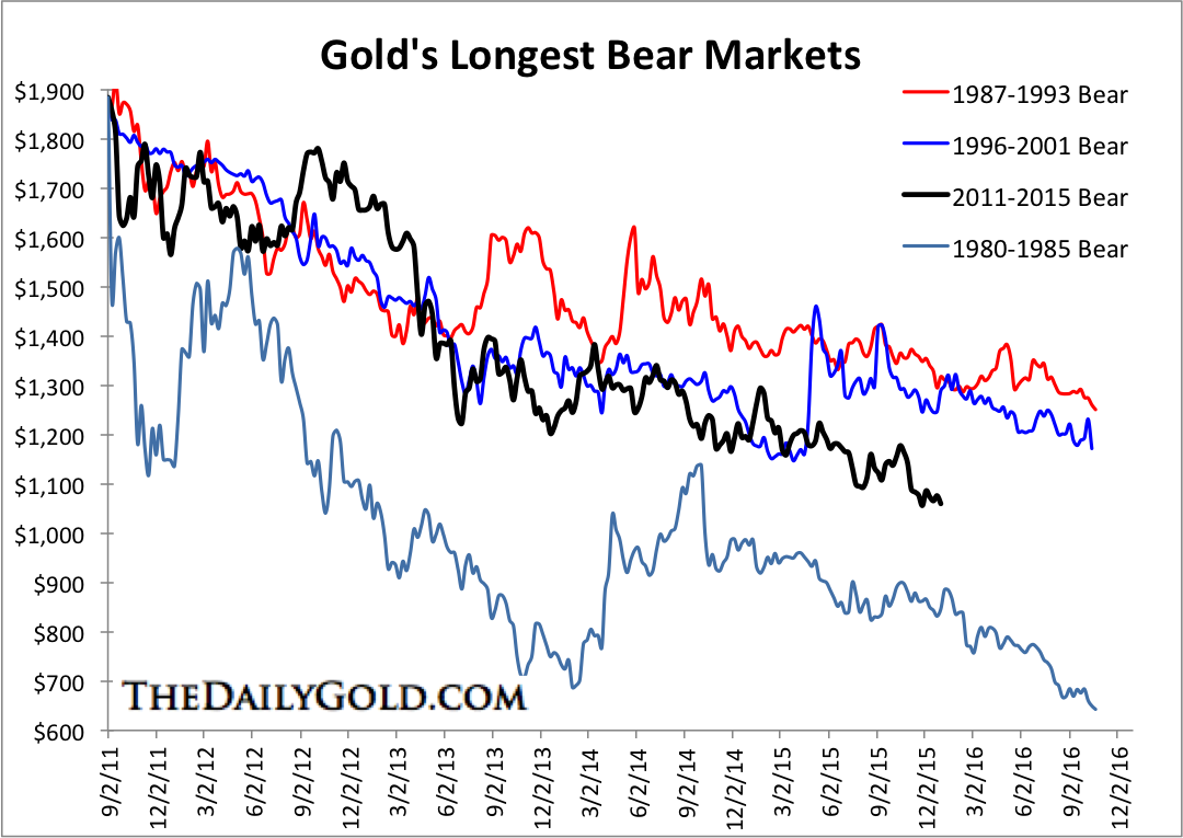 Gold’s bear market is likely to continue in 2016 but the following chart makes a strong case for its death before 2017. No bear market in Gold has lasted past October 2016 (based on the current scale). Furthermore, note that the three other long bear markets enjoyed much larger rallies during their bears. In weekly terms, Gold has not rebounded more than 11% in two years and has not rebounded more than 15% since the bear market began.