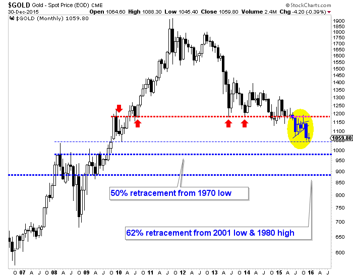 Gold’s monthly chart makes the same case that the bear market will continue in 2016 but likely end before 2017. Gold failed to hold $1180/oz and although it could rally in January 2016 it figures to test $970-$1000/oz. There are very strong support targets at $970/oz and $890/oz. Another leg higher in the greenback would likely coincide with Gold testing one or both of those targets. Be sure to keep in mind that Gold has a tendency to bottom several months ahead of peaks in the US Dollar.