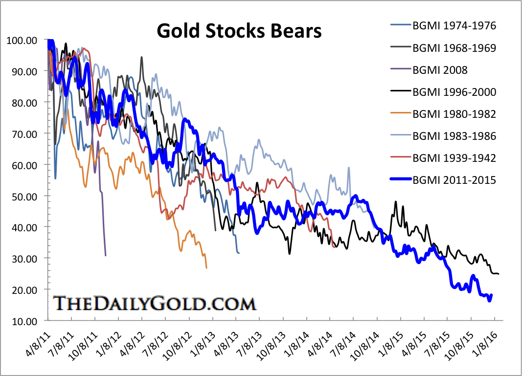 The gold mining sector has been absolutely devastated. The current bear market is already the worst ever in price and if it lasts into the second quarter (2016) then it would be the longest ever. The following chart shows the bear markets in the gold mining stocks dating back nearly 80 years. It is hard to imagine the bear market lasting much longer than another quarter or two.