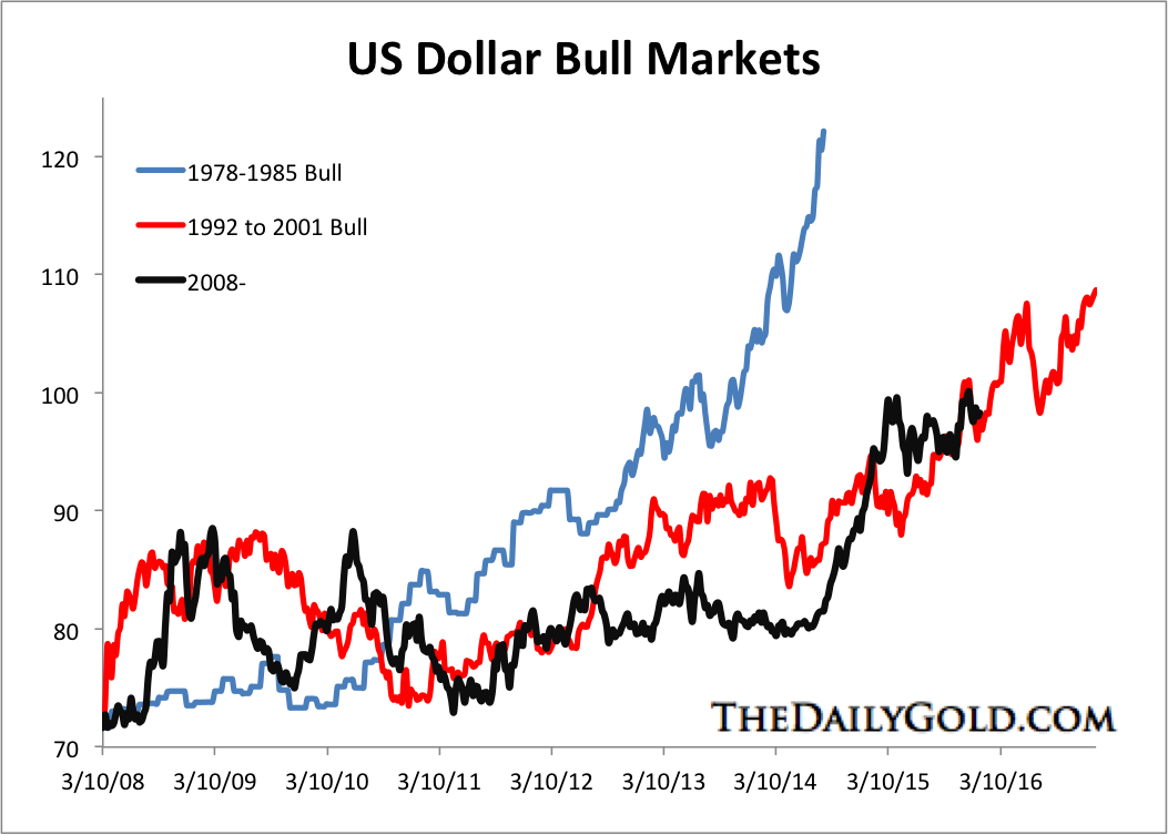 The precious metals sector will close 2015 entrenched in a seemingly forever bear market. Most of the sector has been in a bear market for over four and a half years. Gold’s bear market will reach four and a half years in a few months. Meanwhile the US Dollar’s bull market remains strong and is likely to continue. In this article we discuss our 2016 big picture outlook for the US Dollar, Gold and gold stocks.