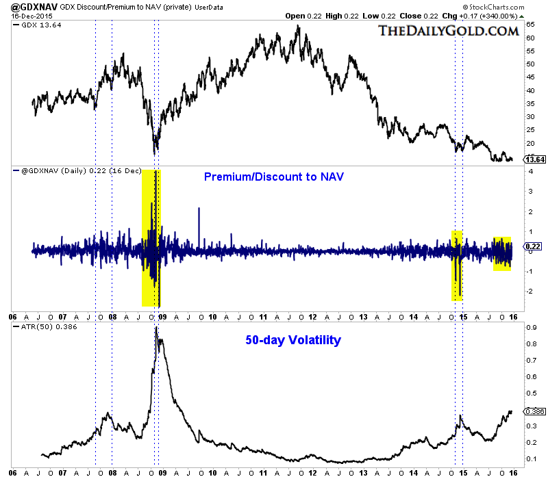 We have not presented this chart publicly until now. It plots GDX and the difference between its premium or discount to NAV. We plot the volatility of that data at the bottom of the chart. Note that spikes in the data or sharp increases in its volatility have coincided with important lows in GDX. As GDX has tried to base in recent months the volatility in its premium or discount to NAV has reached the highest levels since the 2008 low.