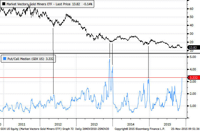 While the next chart is several weeks old it remains relevant and supportive of the bullish case. The chart is from sentimentrader.com and highlights GDX’s median put-call ratio. The data is from Bloomberg. The median put-call ratio recently touched its highest level in two years. Note that a spike in the put call ratio preceded the end of year rallies in each of the past two years.