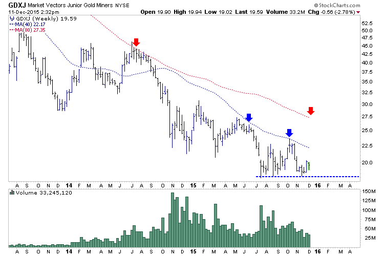 The gold mining indices (GDX, GDXJ, HUI) have essentially held support and built a base since July. GDXJ (shown below) figures to close the week in the mid $19s. If history repeats itself (with respect to Fed actions) then a rebound should begin after the hike and last for a few months. The initial target would be the 200-day moving average ($22) followed by the October high (mid $23) and the 400-day moving average ($27).