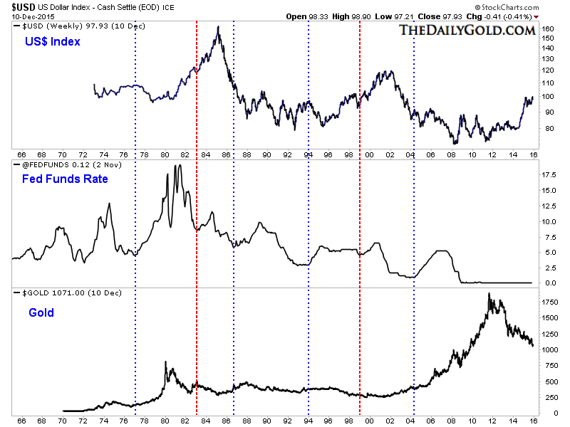 A Fed rate hike could be a catalyst for a decent rebound in hard assets and in gold stocks especially. However, the key word is rebound. History argues for a rebound in the weeks to come but a rebound followed by new highs in the US$ index and new lows in precious metals. This fits with our expectation that the US$ index could surge higher in 2016 and lead to capitulation and the end of the bear market in Gold and Silver. As we navigate the end of this bear market, consider learning more about our premium service including our favorite junior miners which we expect to outperform into 2016.