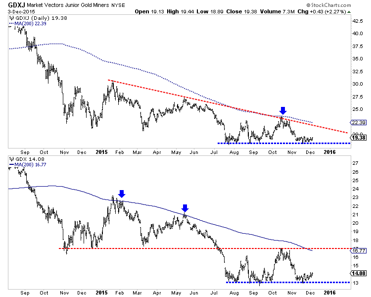 The daily candle charts of GDXJ, GDX and Gold are shown in the image below. Several weeks ago Gold lost $1080 support and made a new low. The miners failed to make a new low then and continued to hold their lows as Gold grinded lower below $1080/oz. Now the miners could reach a one month high very soon while Gold could rally back to resistance at $1100/oz or slightly higher.