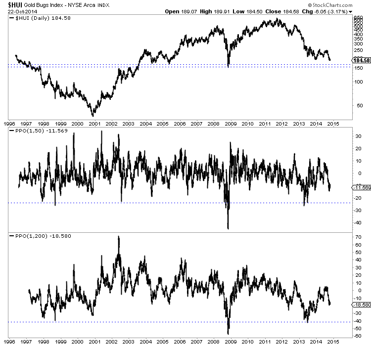 I did not know that this statistic could be found using stockcharts.com’s PPO indicator. Below is a chart of the HUI Gold Bugs index that shows two other plots: its distance from its 50-dma and its distance from its 200-dma. These indicators help us measure overbought and oversold conditions. The HUI is very oversold but its nowhere near as oversold as it was in 2013 (according to these two statistics).