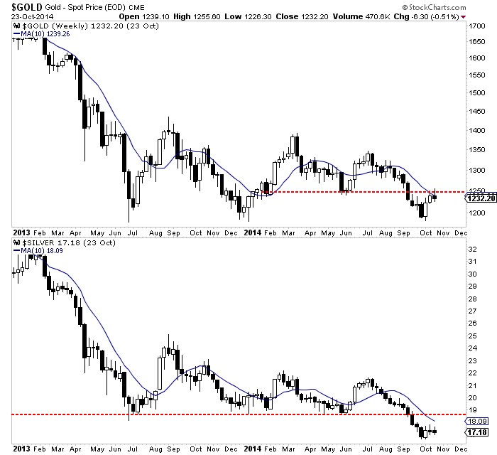 The weekly candle chart below plots Gold and Silver. We can see how Gold has rallied for a few weeks following its weekly close below $1200. Yet over the past two weeks Gold has tested $1250 and failed to close above it. This week Gold will close near the low of the week and below its 50-day or 10-week moving average. Gold is sitting less than 3% above important weekly support and remains below key short-term moving averages. Meanwhile, Silver has not touched $18 yet, let alone rallied back to previous support.