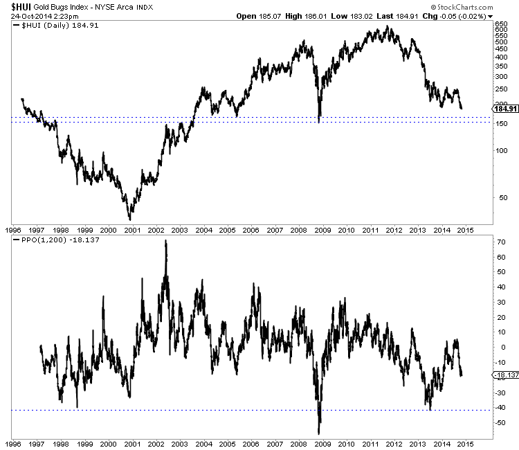 Meanwhile, the HUI Gold Bugs index has already broken to new lows. It has declined eight straight weeks and could close at a new low today. In the chart we plot the HUI’s distance from its 200-day exponential moving average. The current reading is 18%. Major oversold readings can surpass 30%. The HUI can become much more oversold before it puts in a final bottom. Its trading at 185 and there isn’t strong support until the 155 to 168 range.