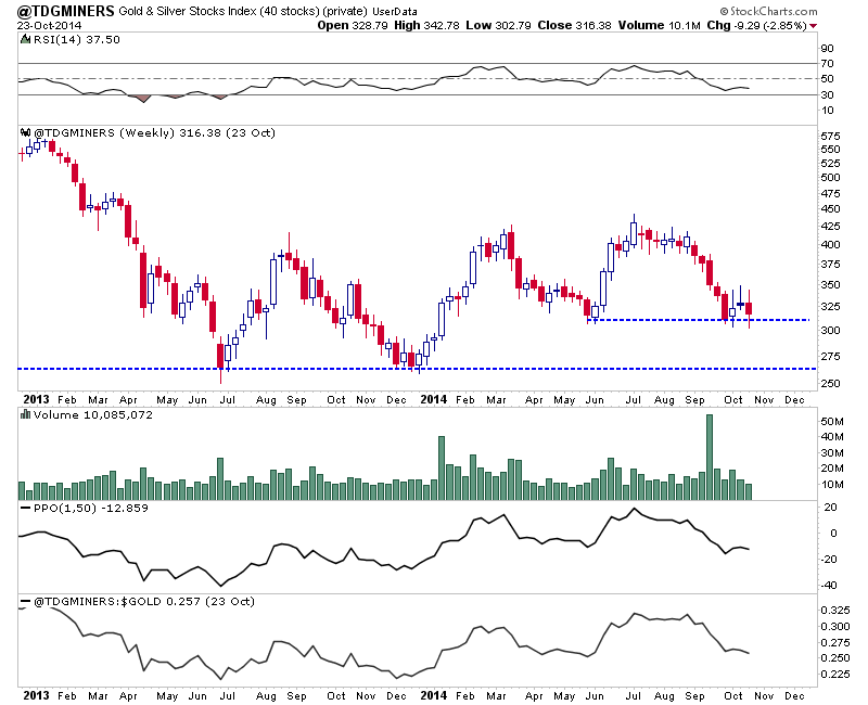 While Gold gained as much as $70/oz, the miners couldn’t sustain any gains. The weekly candle chart below is our top 40 index. It contains various gold and silver stocks and the median capitalization is $520 Million. The index has consistently outperformed GDXJ over the past two years. At present the index is barely holding onto important support. It rebounded for two weeks but closed nowhere near the highs of the week. It reached as high 343 this week but was sitting at 316 heading into Friday. If Gold breaks then this index is headed for a test of the 2013 lows. It’s a strong bearish warning when the higher quality companies are this weak.