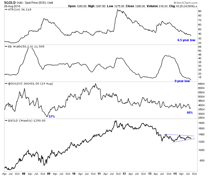 Meanwhile, Gold remains in a listless, trendless state. Volatility indicators are at multi-year lows while open interest is down 46% and recently touched a five year low. These conditions can lead to big moves but not always and not immediately. The price action of Gold suggests that a big move is not necessarily imminent. In any event, Gold is likely to follow the direction of the miners. If the miners breakout in September, it is reasonable to assume that Gold will climb upwards and eventually above $1400.