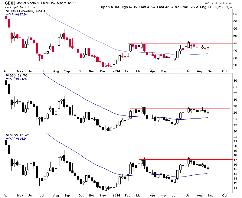Precious metals miners have successfully digested their sharp gains from early summer. The miners have continued to hold above key retracements as well as 200-day moving averages that are now sloping up. The miners, despite some fear from market participants remain in position for a September breakout to the upside.