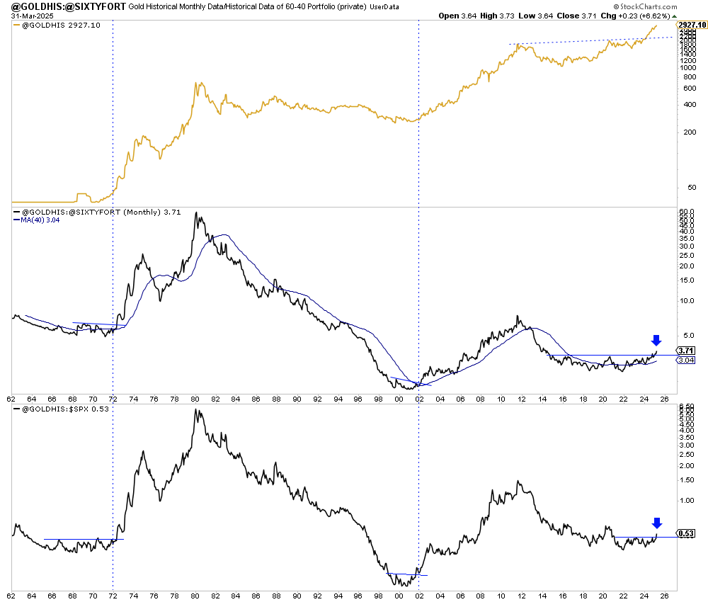 We plot Gold, Gold against the 60/40 Portfolio (middle), and Gold against the S&P 500 (bottom).