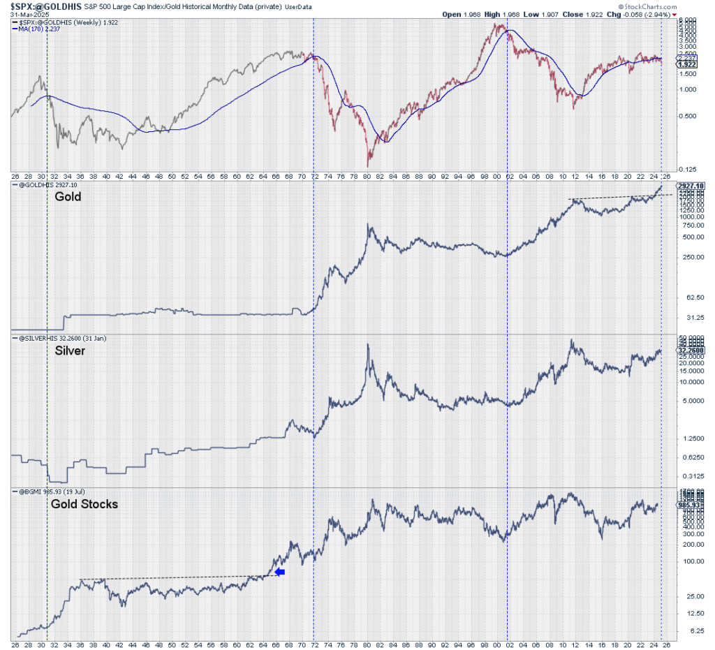 The next chart plots the S&P 500 against Gold (top) along with Gold, Silver, and Barron’s Gold Mining Index.