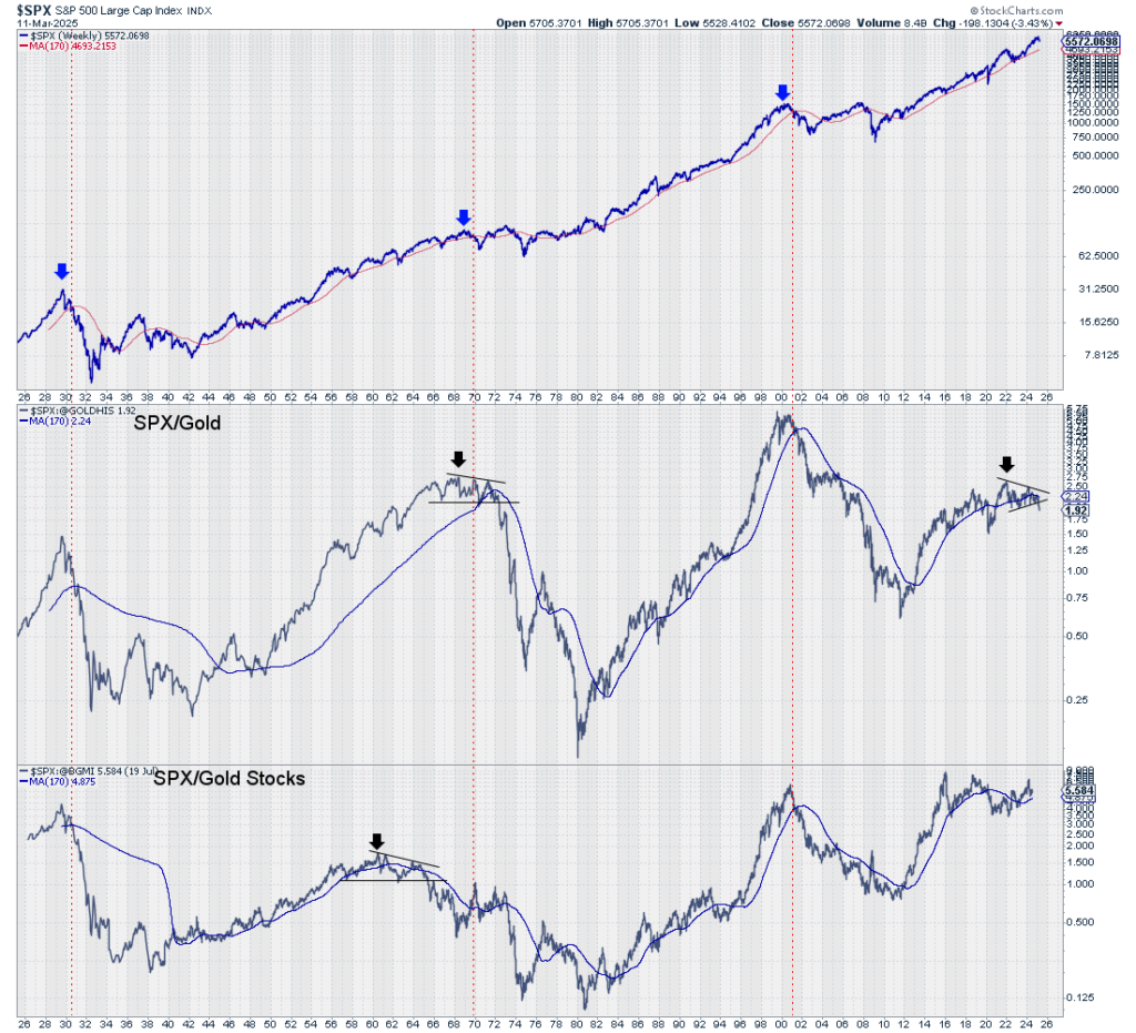 We plot the S&P 500 below, along with the S&P 500 divided by Gold (middle) and the S&P 500 divided by the Barron’s Gold Mining Index (bottom). The red lines mark the points at which the S&P 500 fell below its 40-month moving average. The blue arrows mark the preceding secular peak.