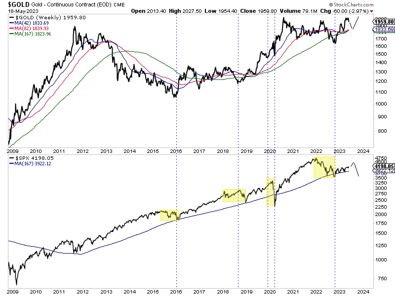In the chart below, we mark key lows in Gold (blue lines) and the associated declines in the stock market (yellow). The next slide in the stock market should set the stage for Gold to make its breakout.