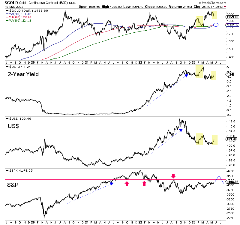 Gold has a confluence of strong support around the mid $1800s. It will not retest or break to a new all-time high until the stock market rolls over again. A market downturn is needed for the Fed to start easing.