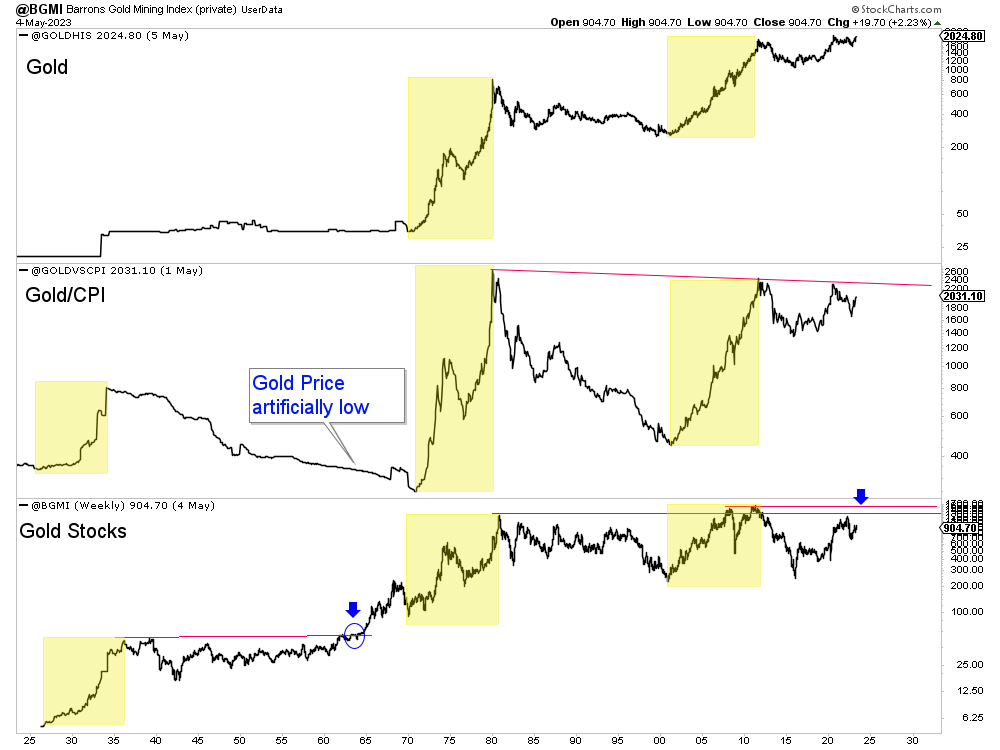 The chart below plots Gold, Gold against the CPI and Barron’s Gold Mining Index.