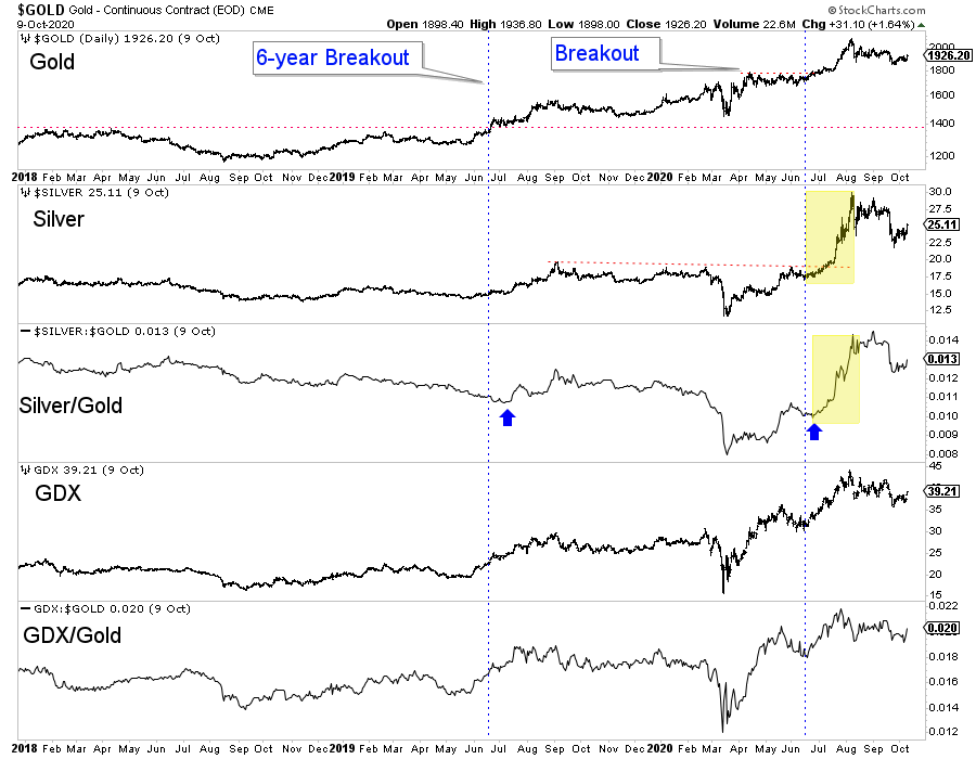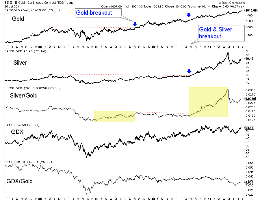 However, let me get more specific about how and when this outperformance could transpire. Look at previous Gold breakouts and how Silver and gold stocks performed.