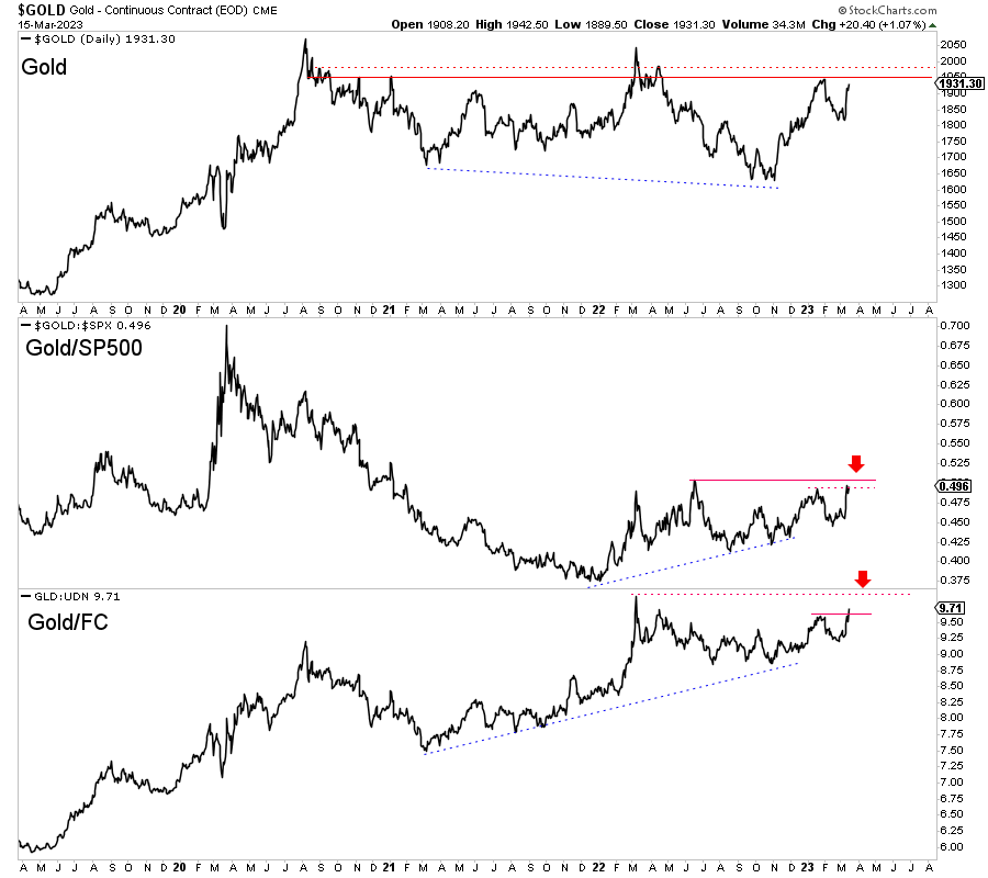 On Wednesday, Gold against the foreign currency basket made its second-highest close ever, while Gold against the stock market made its third-highest close in the last two years. If and when both charts surpass and hold above the red lines (arrows), Gold should be on its way to the August 2020 high.