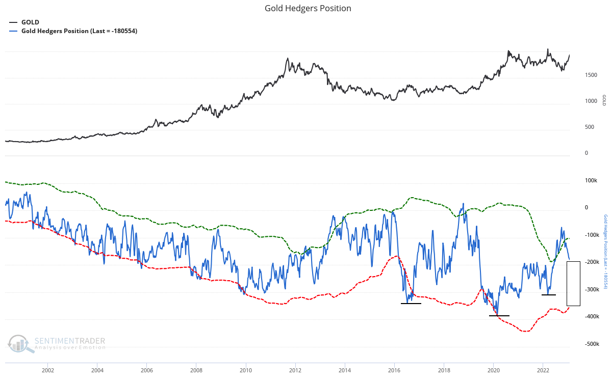 As of Tuesday, the net speculative position was 180K contracts. Roughly nine months ago, with Gold trading above $2000/oz, it was over 300K contracts. During the 2019 breakout, the position nearly reached 400K contracts. (Chart from SentimenTrader.com with my annotations).