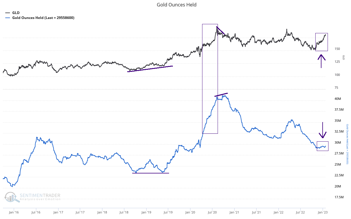 The number of ounces held in the GLD ETF has barely moved during this rebound. There was limited demand right before Gold’s breakout and 2019 and excessive demand leading up to Gold’s peak in August 2020. (Chart from SentimenTrader.com with my annotations).