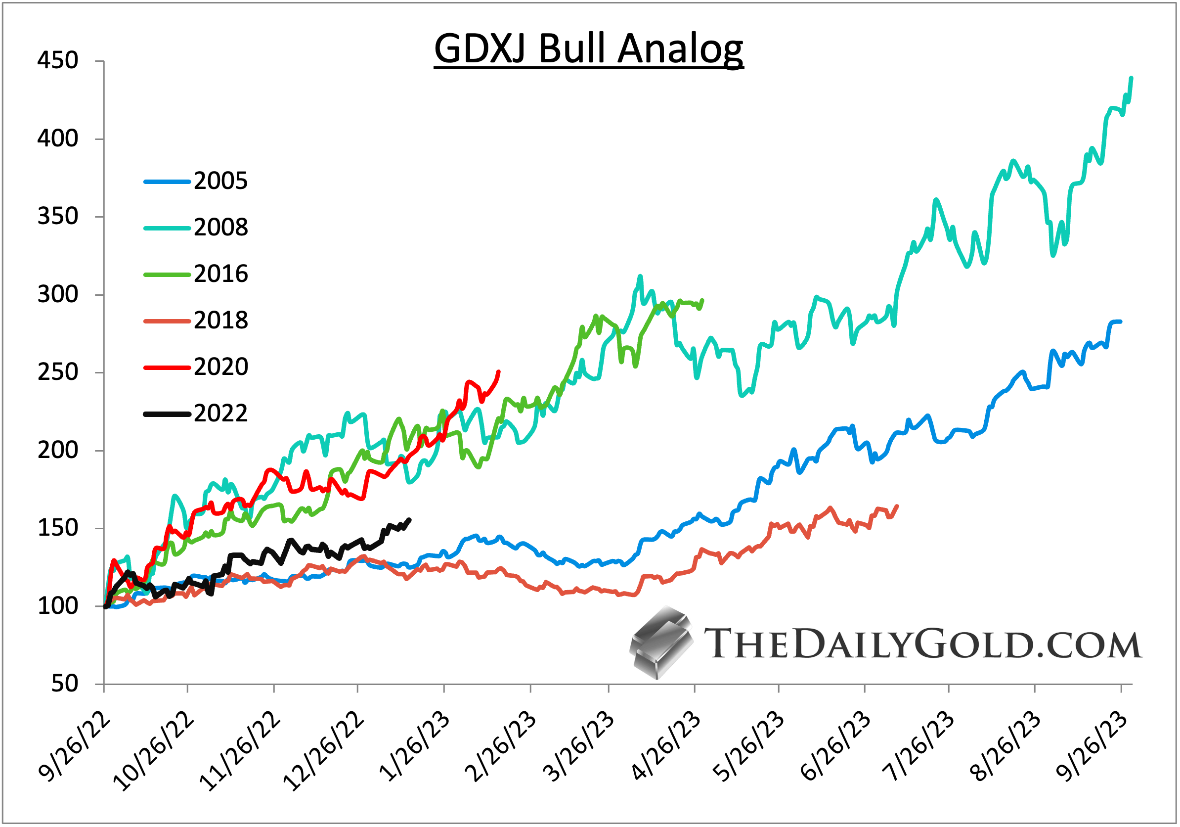Below we plot the major rebounds in GDXJ on the same scale. The black, the current rebound, is slightly ahead of 2005 but well below the 2008 cyclical bull market.