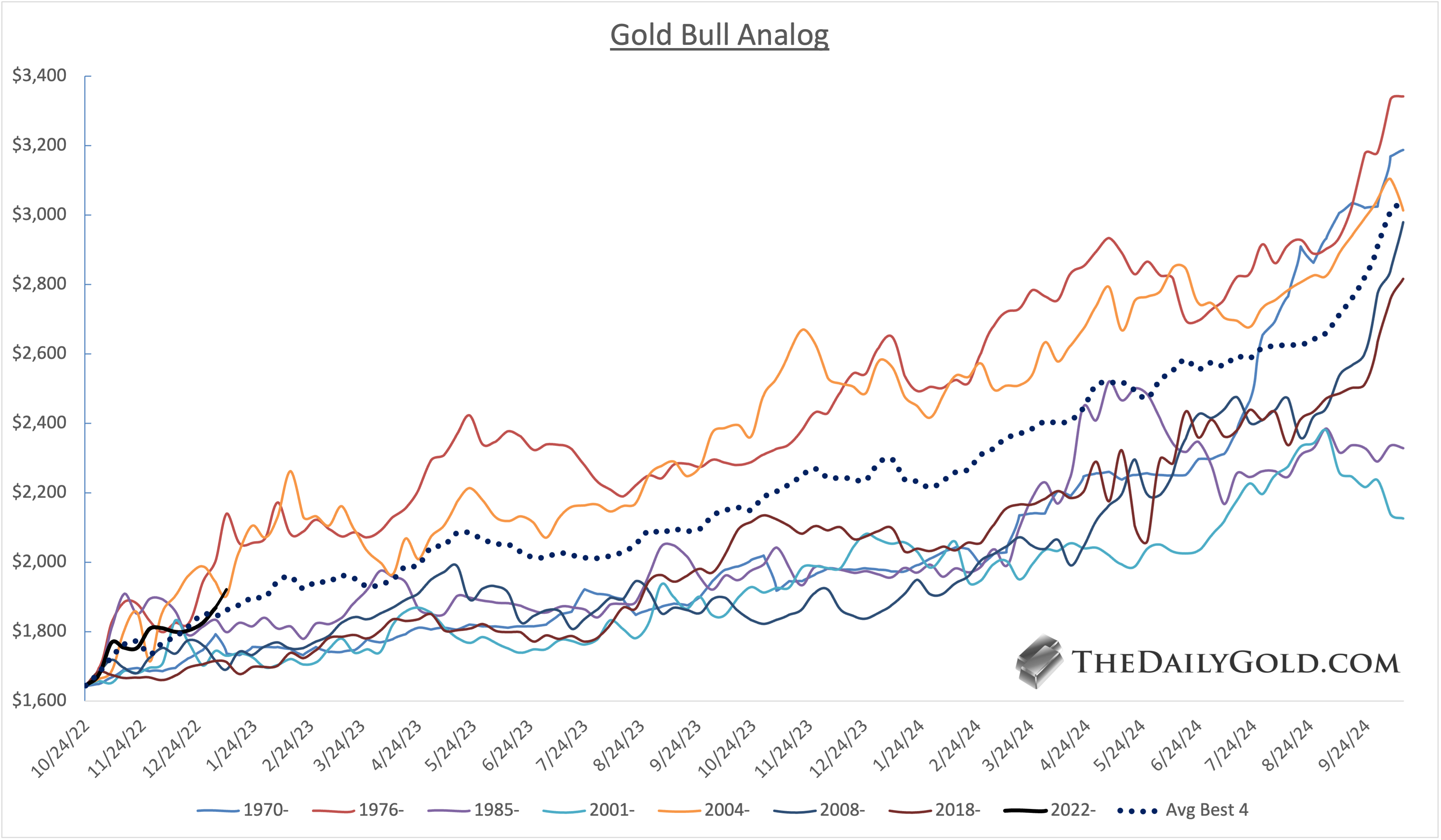 Gold rebounded roughly 50% in the seven months following its August 1976 low. During that period, Gold corrected only 5% and 8%. In fact, Gold did not correct more than 12% until two years after that bottom.