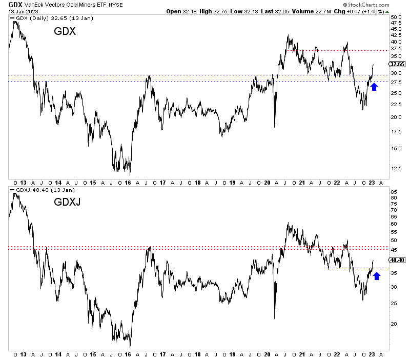 Technically, GDX and GDXJ just broke out two weeks ago. Note the blue arrows.