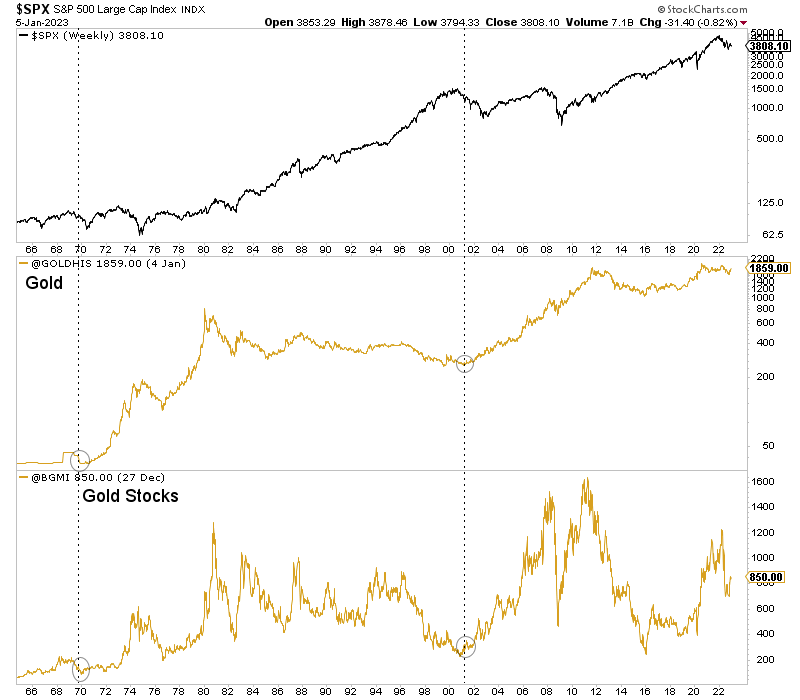 Coincidentally, those downturns marked the start of secular bear markets in the S&P 500 and secular bull markets in Gold.