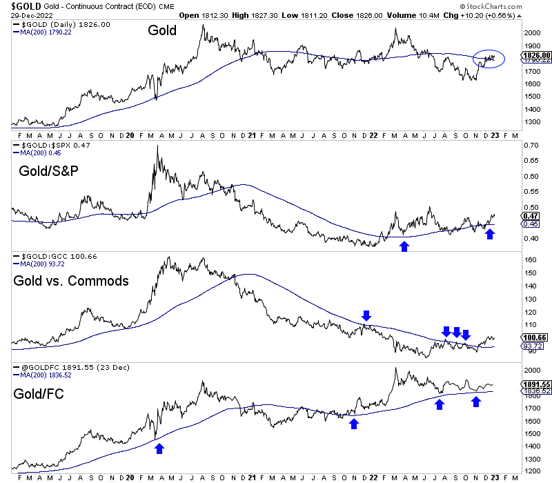 Meanwhile, Gold against the stock market, commodities, and foreign currencies is trading above upward-sloping 200-day moving averages. Gold against the stock market is close to a 52-week high, and Gold against commodities recently hit a 10-month high.