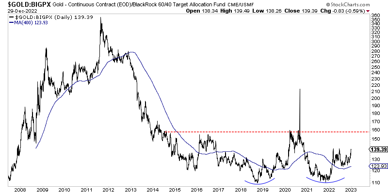 We plot Gold against BIGPX, a BlackRock fund that mirrors the 60/40 portfolio (60% Stocks, 40% Bonds).
