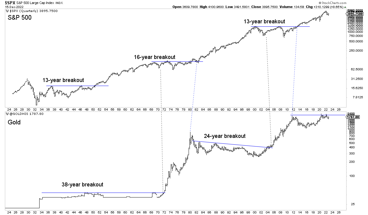 In the chart below we find that multi-decade breakouts in Gold and the S&P 500 usually follow a major secular peak in the counterpart.
