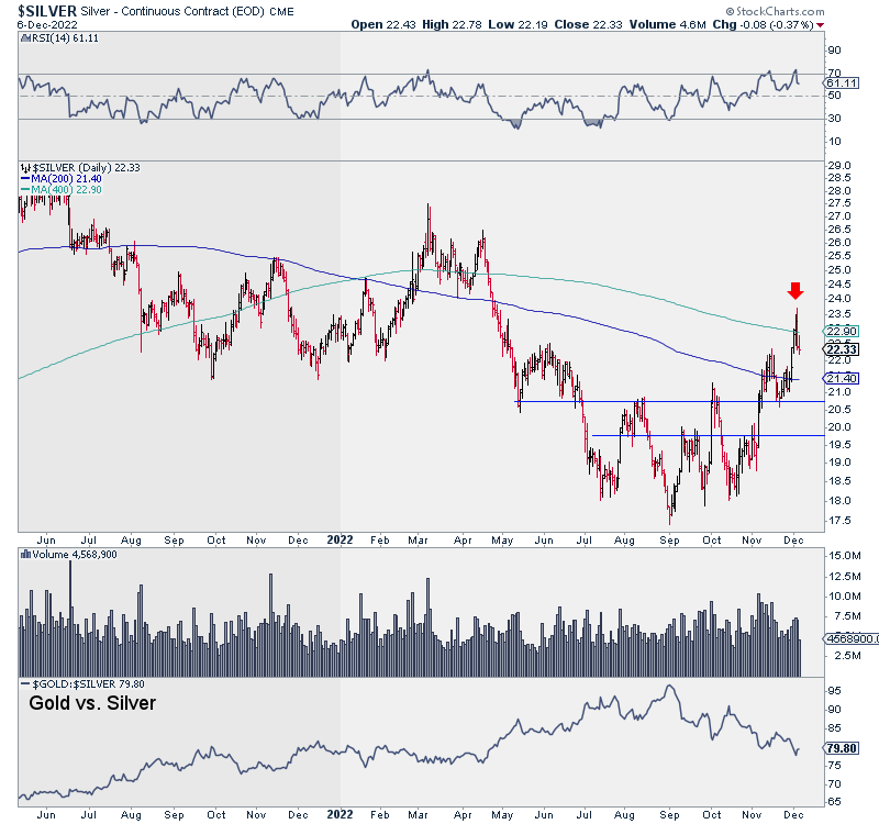 Silver rallied up to and reversed course at its 400-day moving average. The next support levels are $20.75 and $19.75.
