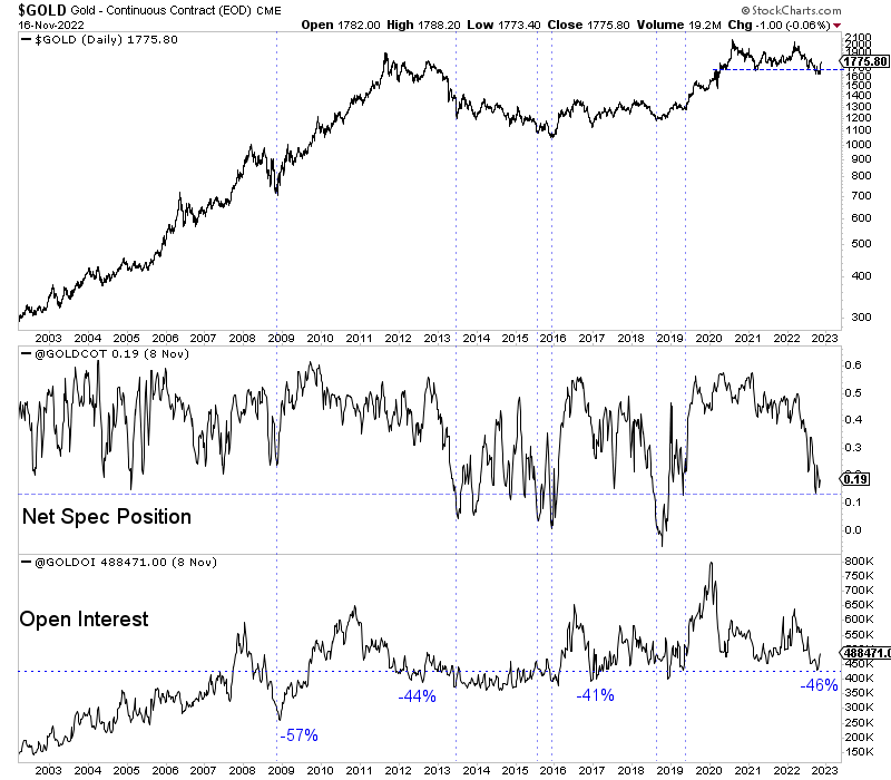 However, open interest experienced its second-largest decline in the last 20 years, reaching a three-and-a-half-year low. So who is to say the net speculative position has to fall below 10% and that 13% is not low enough?