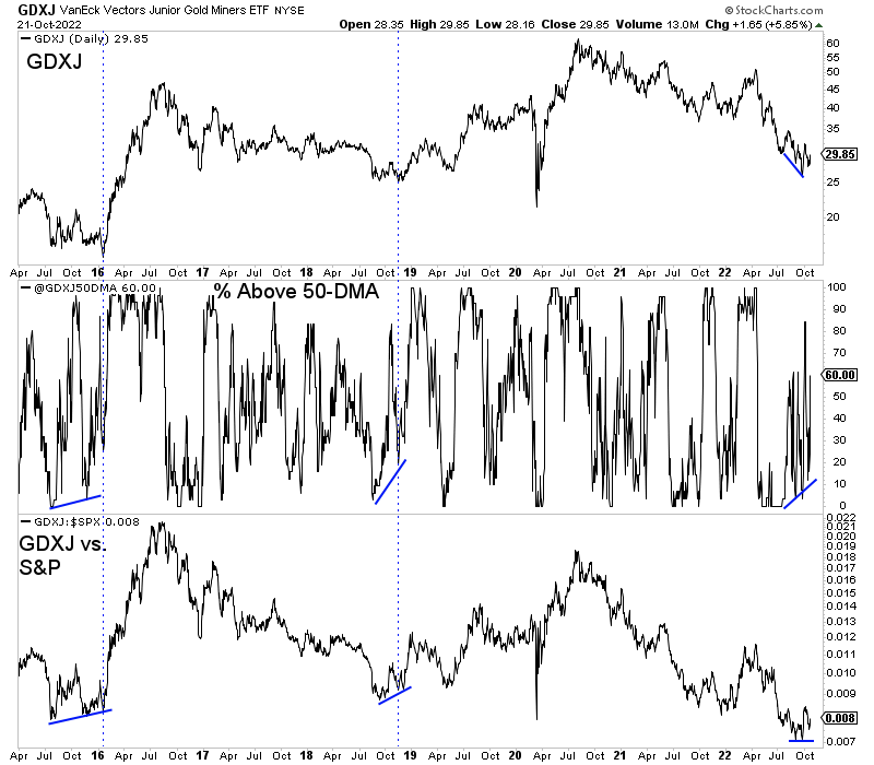 The percentage of GDXJ stocks trading above the 50-day moving average trended higher as GDXJ made a lower low and the GDXJ to S&P 500 ratio hit bottom before GDXJ.
