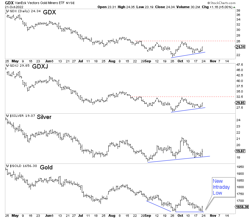 Second, before Gold reversed on Friday, it traded $1 lower than its low at the end of September. Silver, GDX, and GDXJ were not even close to making a lower low on Friday.