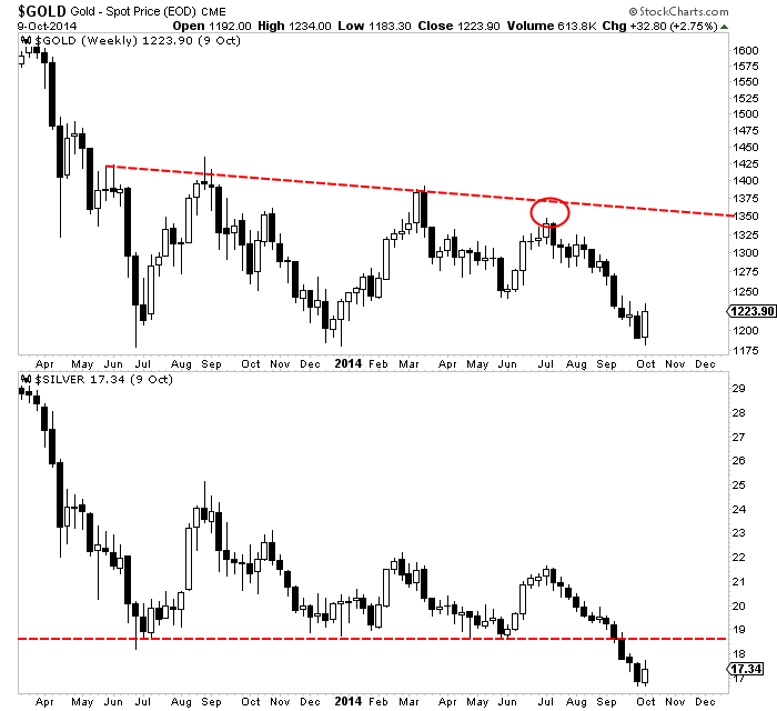 Another reason to be skeptical is Gold and Silver have major, multiyear levels of support below current levels. As we noted last week, Gold has its 50% retracement at $1080 while the monthly charts for both metals illustrate the strength of support below $1100 in Gold and at $15 in Silver.