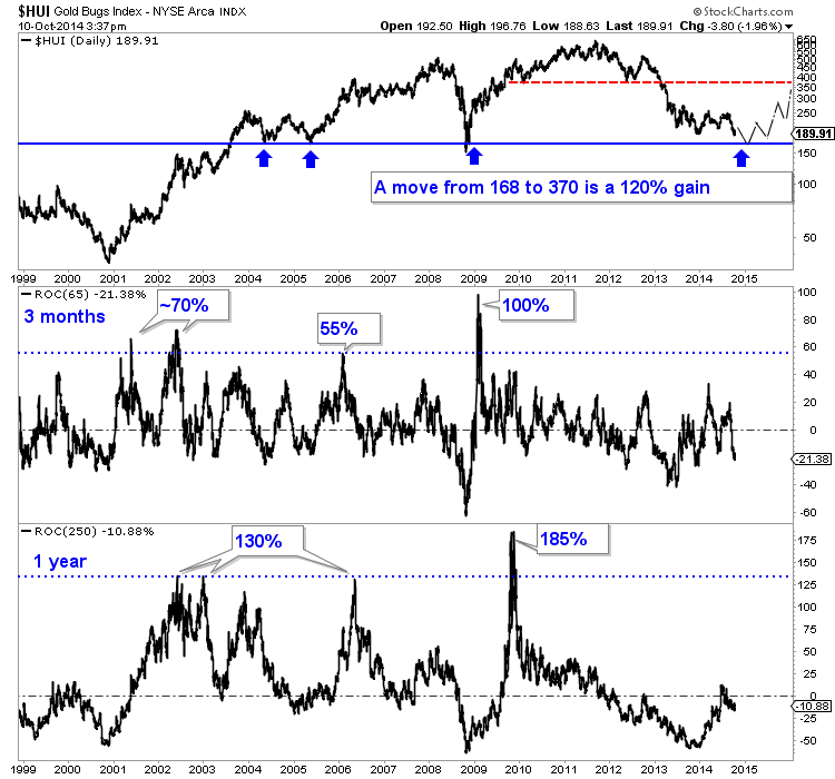 The same can be said for the mining stocks. As we pen this, GDXJ has about 11% downside to its December 2013 low. The HUI Gold bugs index has about 12% downside to multiyear support at 168. We also plot the HUI’s rolling rate of change over three months and one year.