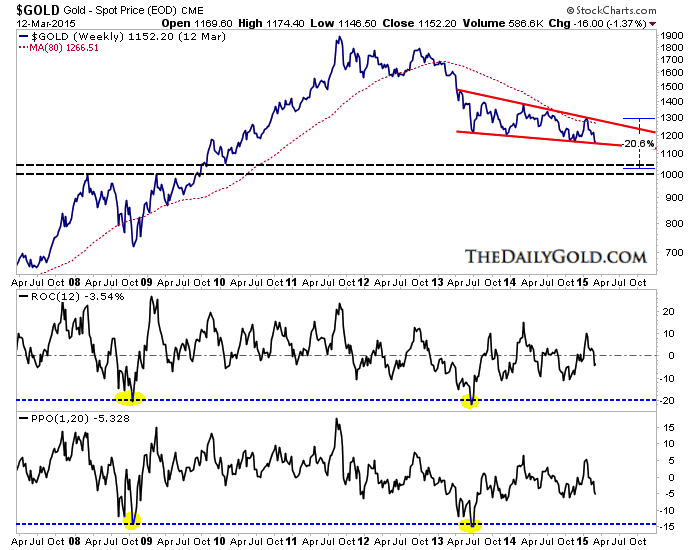 Below is Gold’s weekly line chart dating back to 2007. The metal has traded within in a slight descending channel for nearly two years. A break below such a channel would typically lead to an accelerated decline. If Gold makes a clear weekly close below $1150/oz then it could start to break lower in accelerated fashion towards $1080/oz, the 50% retracement of the entire bull market. Gold does not have strong support until the $1000 to $1040/oz range. Also, though Gold is extremely oversold in a long term sense, that is not the case from a near term view. A move below $1080/oz within the next seven weeks would bring Gold to an extreme near-term oversold condition.