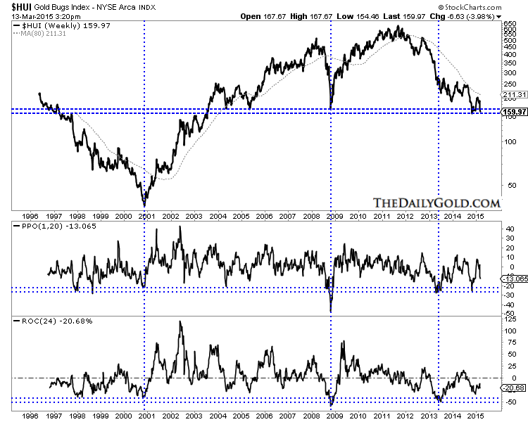 A few weeks ago we posited that gold stocks could hold the recent lows and perhaps form a huge double bottom. That is now highly unlikely as the sector sold off aggressively when Gold lost $1200. The HUI, trading around 160 has support at 150 to 160. Like Gold it is not yet extremely oversold in the near term sense and lacks immediate downside support. The indicators shown on the chart have much further to go before they reach the extremes seen in 2000, 2008 and 2013. Traders and investors need to be aware of the severe downside potential before a bear market bottom.