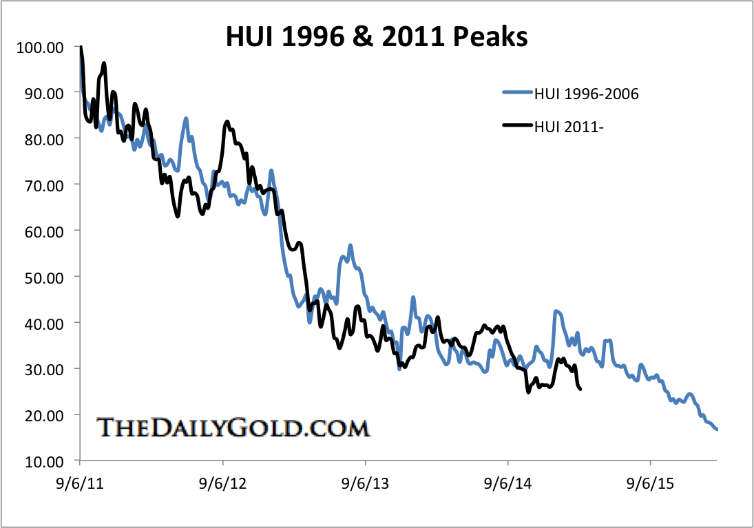 The gold stocks are entering the fourth year of their bear market and have essentially repeated the 1996-2000 bear market. In the chart below we compare the HUI’s current bear with its 1996-2000 bear. Note that the HUI made a marginal new high five months after the majority of mining stocks peaked. Otherwise its resemblance would be even closer to its 1996-2000 bear.