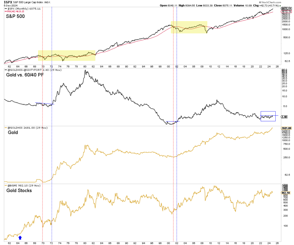 The difference is that Gold has yet to outperform the stock market as gold stocks did in the mid to late 1960s.