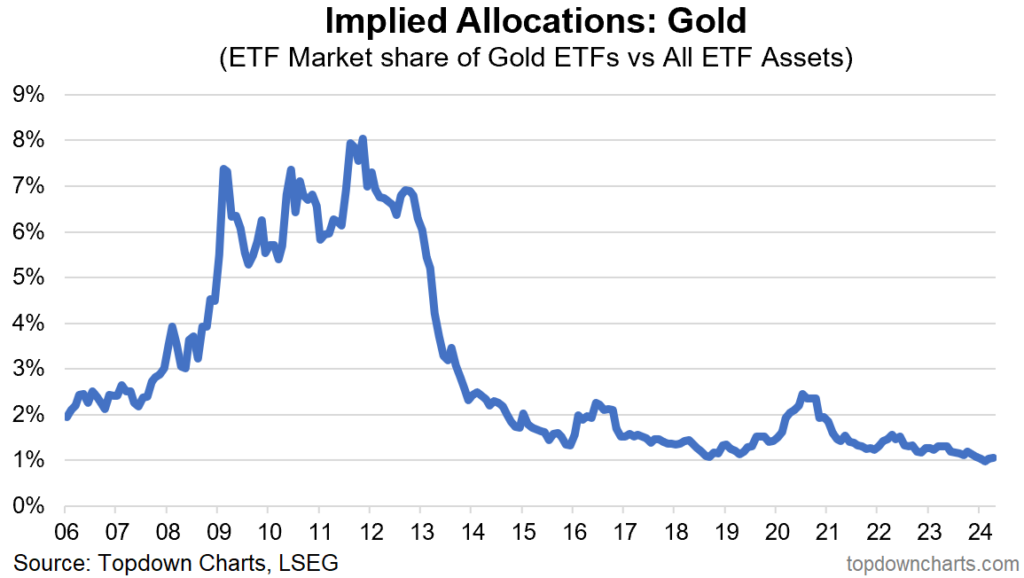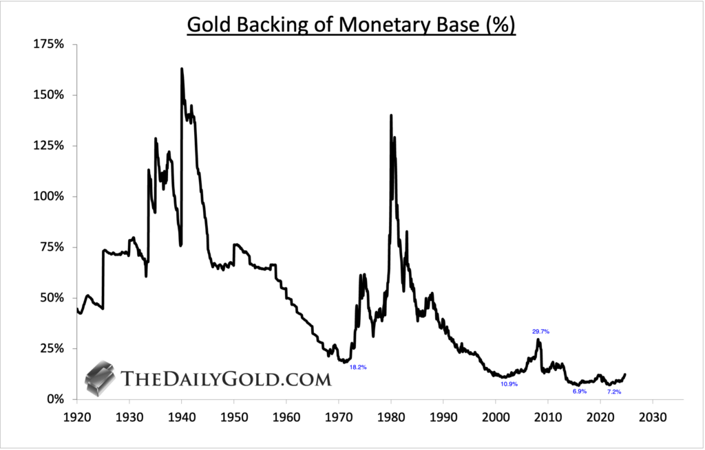 Backing has increased from an all-time low of 7% a few years ago to 12.4% today. Reaching the 2008 peak of nearly 30% would put the Gold price at almost $6,500/oz.